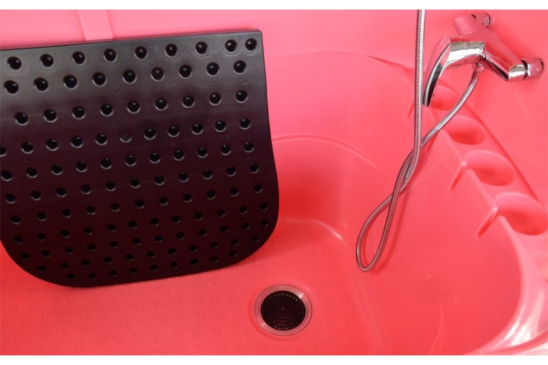 Een polyethyleen bad in de kleur roze op poten inclusief met spatwand en kraanset op electrisch verstelbaar onderstel dat is voorzien van witte poedercoating.